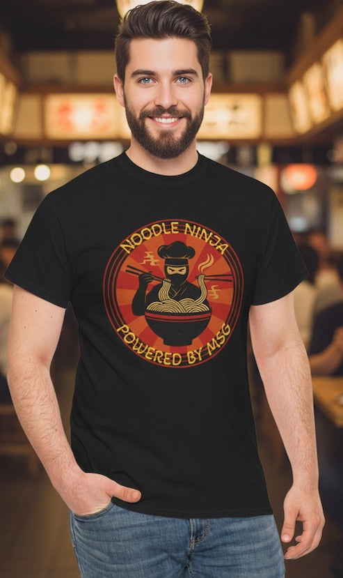 “Noodle Ninja — Powered by MSG” a little wink to all the ramen lovers, kitchen experimenters, and anyone who treats comfort food like a small ritual, with a dash or MSG. Yeah.. a little culinary swagger.